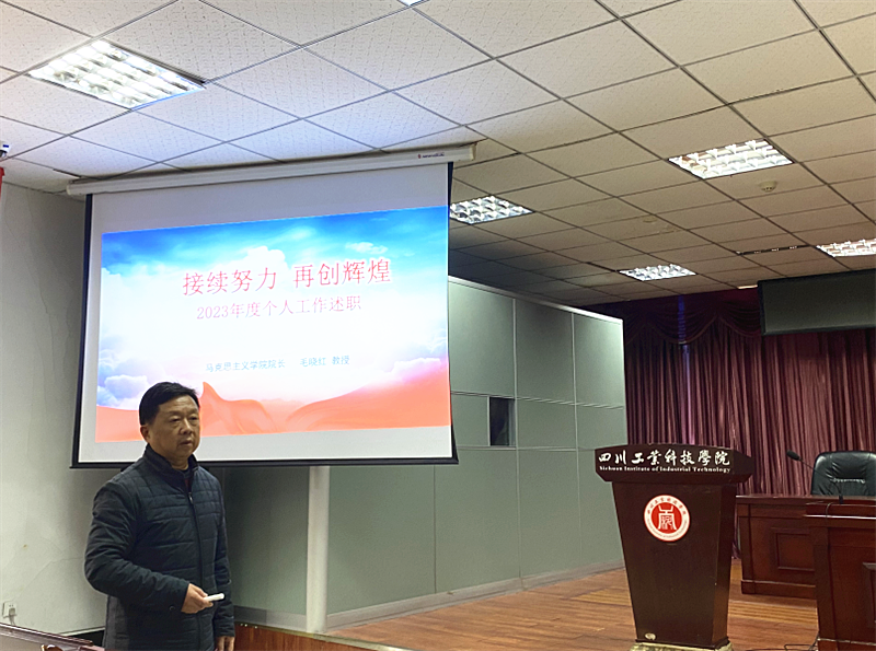 会议上,院长毛晓红首先代表学院领导班子开展年度个人工作述职。毛晓红以“接续努力 再创辉煌”为题,从学院工作、个人工作、存在的不足和今后工作思路四个方面,对2023年度的工作进行总结梳理。毛晓红全面总结了2023年度马克思主义学院工作取得的主要成就,同时指出了当前工作中存在的不足,针对存在的问题对2024年学院工作进行了前瞻性部署。他强调,马克思主义学院建设任重道远,鼓励教职员工全面加强教学、科研和学科建设,凝心聚力、同心同德,为学校本科教学评估顺利通过、为实现马克思主义学院高质量发展而团结奋斗。
