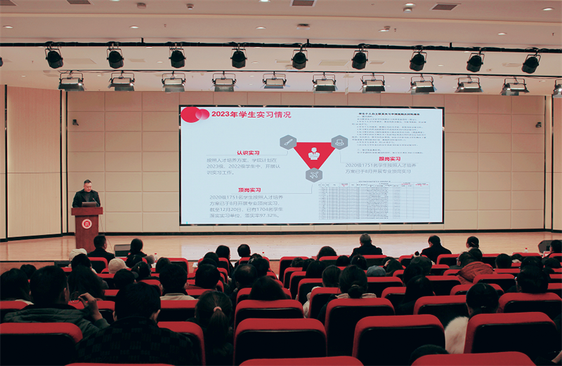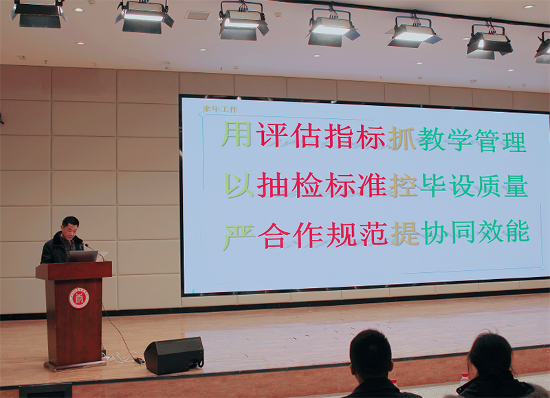 龙厚彦汇报了过去一年的教学规范化管理和毕业论文(设计)工作具体开展情况,通过具体实例和数据展示了学院在教学管理、教学督导、专业建设、课程建设、毕业论文(设计)、校企合作六个方面取得的成绩和发展。