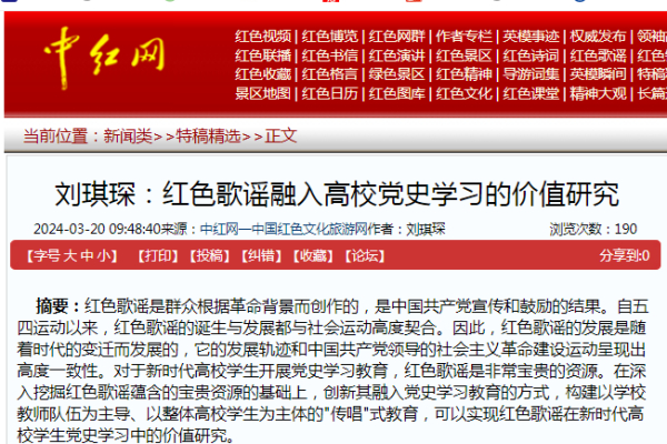 西华师范大学刘琪琛撰写的文章《红色歌谣融入高校党史学习的价值研究》被中红网以特稿转载,该文对红色歌谣融入高校党史学习的重要性、必要性和客观性进行阐释,指出红色歌谣融入高校党史学习的教育意义、现实意义和政治意义,对党史学习教育常态化开展有促进作用。