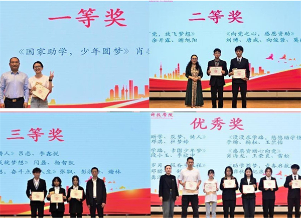 4月24日,学校首届“感恩资助心向党·政策宣传我来讲”微视频大赛颁奖典礼在龑江C区报告厅隆重举行。学校党委副书记,教务处副处长,学工部部长蒋,校团委书记,各二级学院书记(副书记)出席活动。学生资助管理中心全体教师、获奖师生和各二级学院学生代表参加活动。