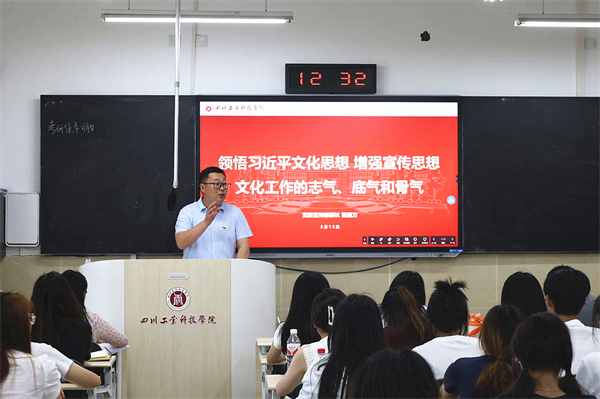 雷耀方以《领悟习近平文化思想,增强宣传思想文化工作的志气、底气和骨气》为题进行授课。他从习近平文化思想提出的过程、习近平文化思想的深刻内涵以及习近平文化思想之于高校宣传思想文化工作怎么做三个方面展开,对习近平文化思想作了深刻阐述。他指出,在新时代新征程上,大学生宣传思想文化工作事关青年一代的信念构筑,事关高校人才培养质量和水平,事关文化软实力的提升,更关系到党和国家的意识形态安全,是一项必要的、重要的、紧迫的工作。他要求学校的宣传工作者一是要加强理论武装,提振青年大学生信心;二是要把握传播规律,实现与青年大学生话语同频共振;三是要坚持阵地意识,构建青年大学生自我实现平台。