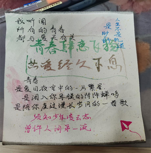 本次活动,同学们围绕主题进行了“青春的模样”代表物设计、“我们的故事”自绘以及“以青春之名”杂志创作。在“青春的模样”代表物设计活动中,同学们发挥创意,淋漓尽致地将青春的模样展现在我们眼前。在“我们的故事”自绘环节,同学们用画笔记录青春故事,描绘校园生活趣事和未来憧憬。一幅幅画,传递着青春的温暖与力量。在“以青春之名”杂志创作的活动上,同学们通过文字、图片展现出青春风采。有同学提到“青春是丛林、是荒原,是阳光炙热的奔跑,是大雨滂沱的伫立,愿我们的青春无悔。”同学们以极富创意与个性的方式,诠释着青春的多彩模样,充分展现了青春独有的风采与魅力。
