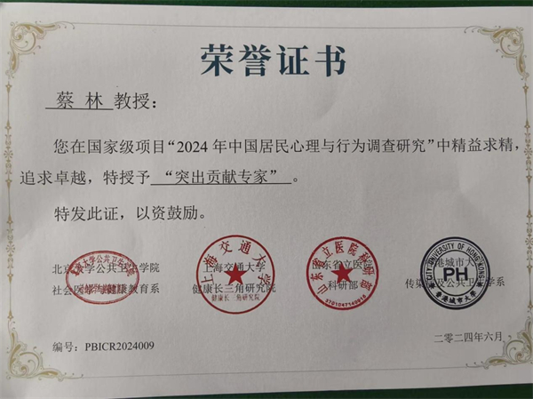开幕会上,2024年中国居民心理与行为调查研究项目发起人吴一波对调查研究进行了回顾,总结了过去4年的研究成果,并从研究人群、研究设计、测量工具、研究策略和研究范围五方面介绍了项目发展情况。为表彰过去四年中对中国居民心理与行为调查研究做出突出贡献的个人和团队,大会举行了荣誉颁奖仪式。学校马克思主义学院蔡林副教授荣获2024年中国居民心理与行为调查研究项目“突出贡献专家”。