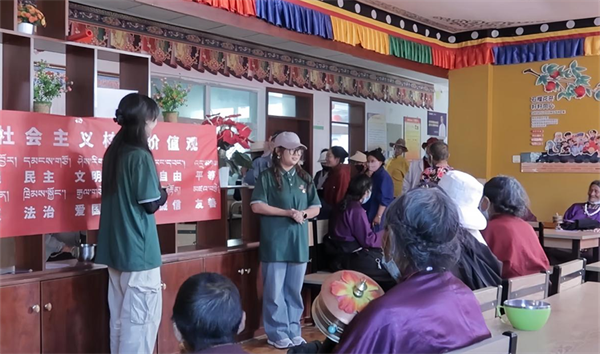 告别了代格村幼儿园的孩子们后,志愿者们又来到了玉树新寨慈善敬老院。在这里,他们举办了一场别开生面的“双语故事会”。志愿者们运用普通话和藏语双语为老人们讲述了一系列关于社会主义核心价值观在日常生活中的应用故事。这些故事贴近生活、感人至深,让老人们在轻松愉快的氛围中感受到了社会的温暖与关爱。同时志愿者们还通过故事讲述传递了中华民族优秀传统文化的精髓,引导老人们树立正确的价值观和人生观。