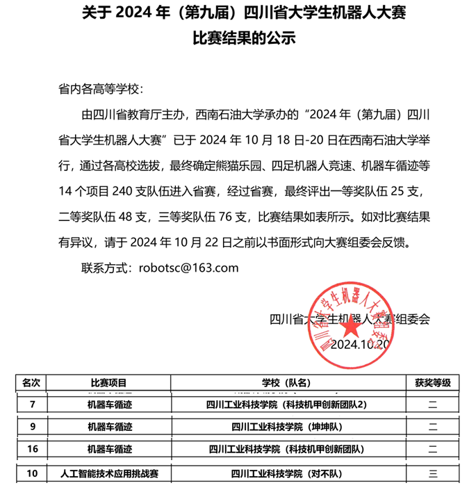 10月18日至20日,由四川省教育厅主办、西南石油大学承办的2024年(第九届)四川省大学生机器人大赛在西南石油大学举行。来自成都理工大学、西南石油大学、西南科技大学和四川工业科技学院等40余所高校的1300余名学子组成的240支参赛队伍参加比赛。智能制造与车辆工程学院共派出4支队伍参加机器车循迹赛、人工智能技术应用挑战赛两个赛项,获得二等奖3项、三等奖1项。
