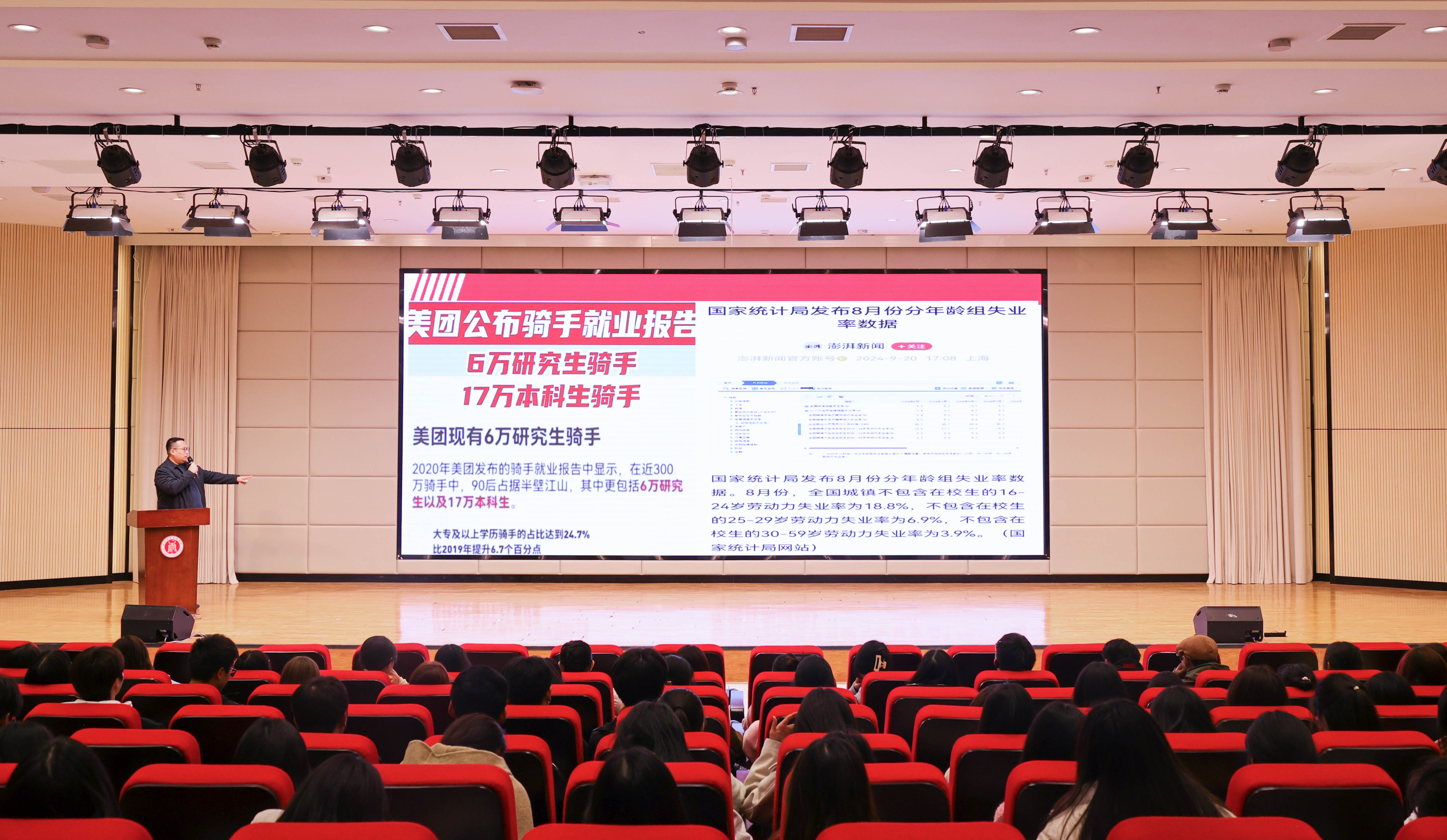 讲座伊始,主讲人王东老师详细剖析了国内高校毕业就业现状和大学教育与就业技能分离的现象。当前国内大学毕业生数量持续增长,而大学教育在很大程度上侧重于理论知识传授,这与就业市场所需的实践技能和职业素养培养衔接不足,导致许多毕业生在求职过程中面临困境,难以迅速适应职场需求。