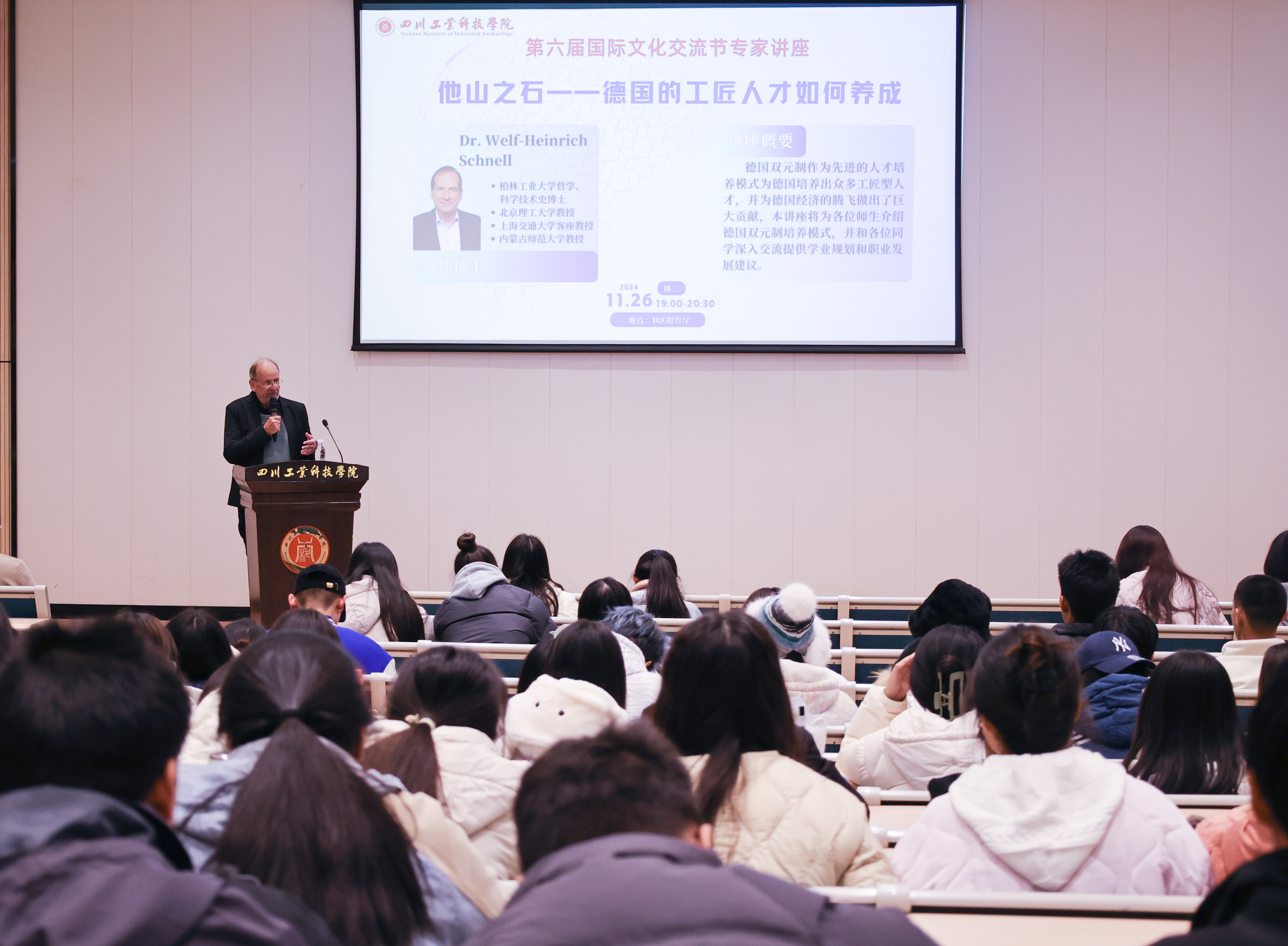 11月26日,德国汉学家、知名教授Dr.Welf-Heinrich Schnell(维快博士)到校考察交流,并在学校龑江B区报告厅举办了题为《他山之石——德国的工匠人才如何养成》的学术讲座,吸引众多师生踊跃参与。