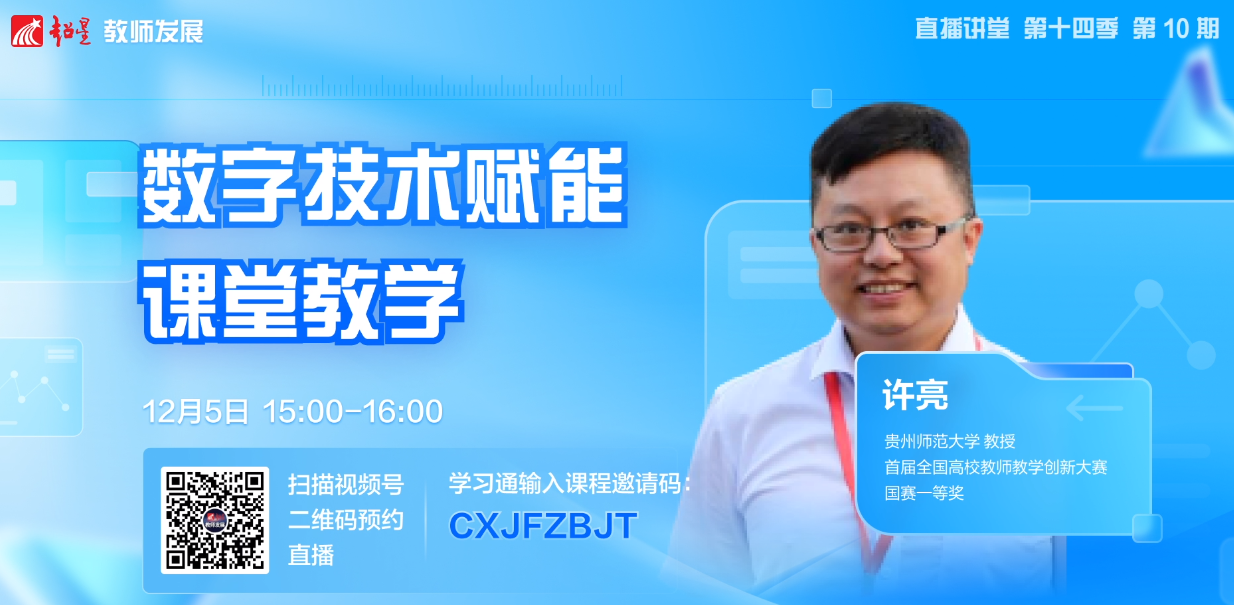 12月5日下午,四川工业科技学院教务处教师发展中心组织开展了超星教师发展直播讲堂第十四季第10期网络培训。本次培训特邀贵州师范大学的许亮教授,为全校无课教师带来了一场主题为“数字技术赋能课堂教学”的主旨汇报。