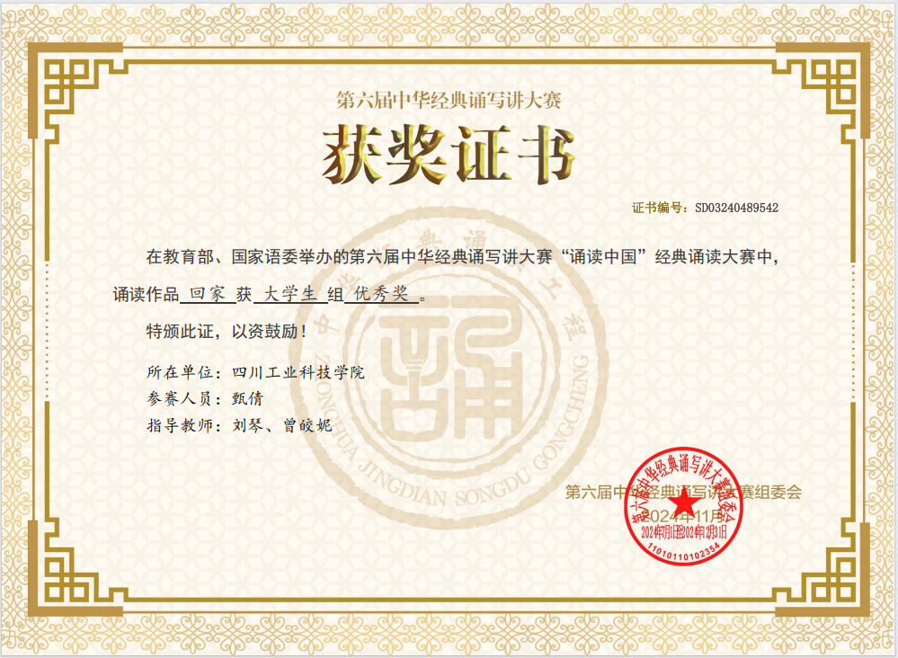 在“诵读中国”经典诵读大赛中,学校教育学院学生甄倩凭借诵读作品《回家》,以其深情并茂的演绎、准确无误的发音和独到的情感理解,赢得了评委和观众的一致好评。经过激烈的角逐,甄倩荣获大学生组优秀奖。这一成绩的取得,离不开甄倩同学自身的努力和才华,更得益于指导教师刘琴、曾皎妮的悉心指导和无私付出。