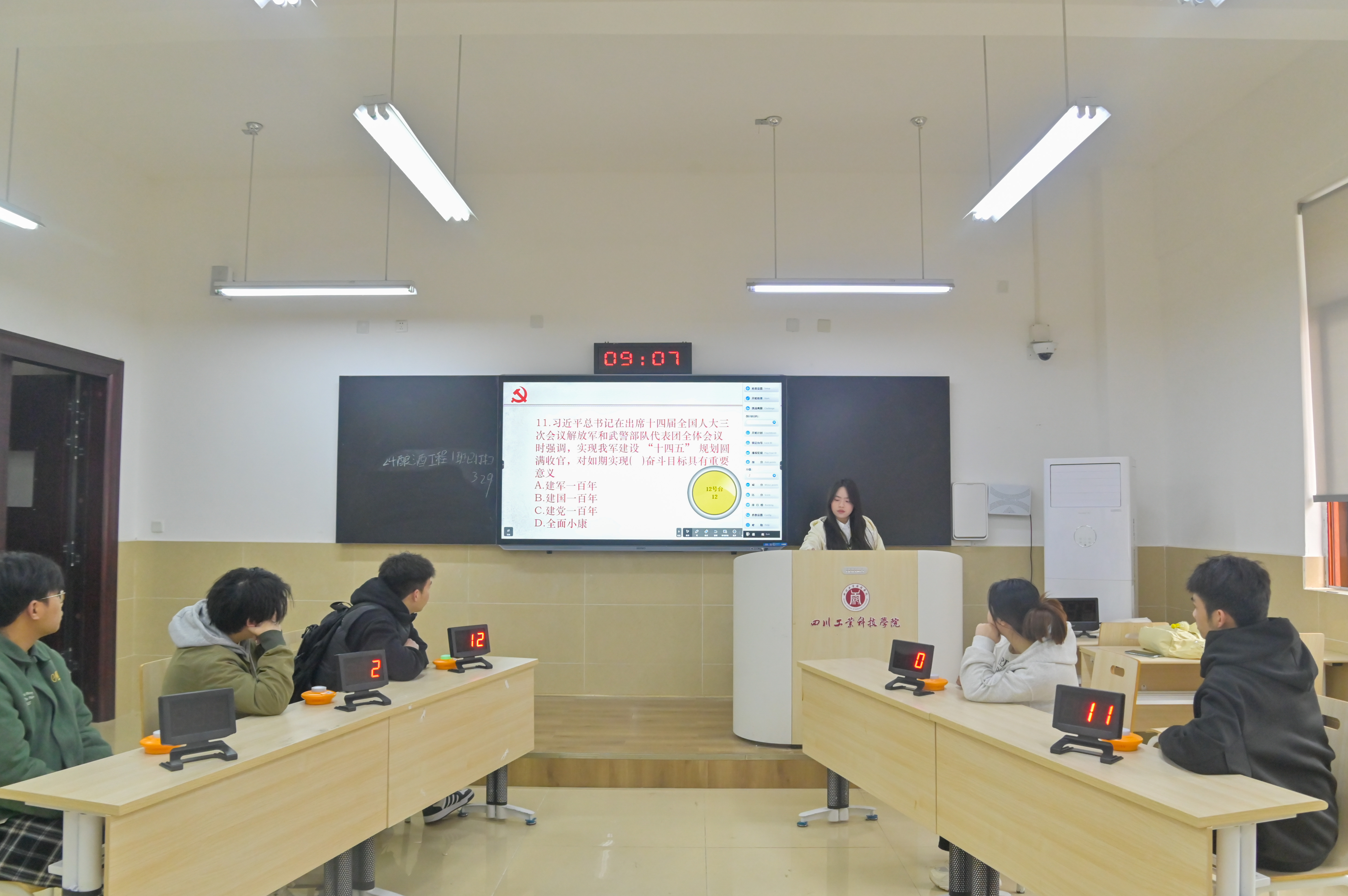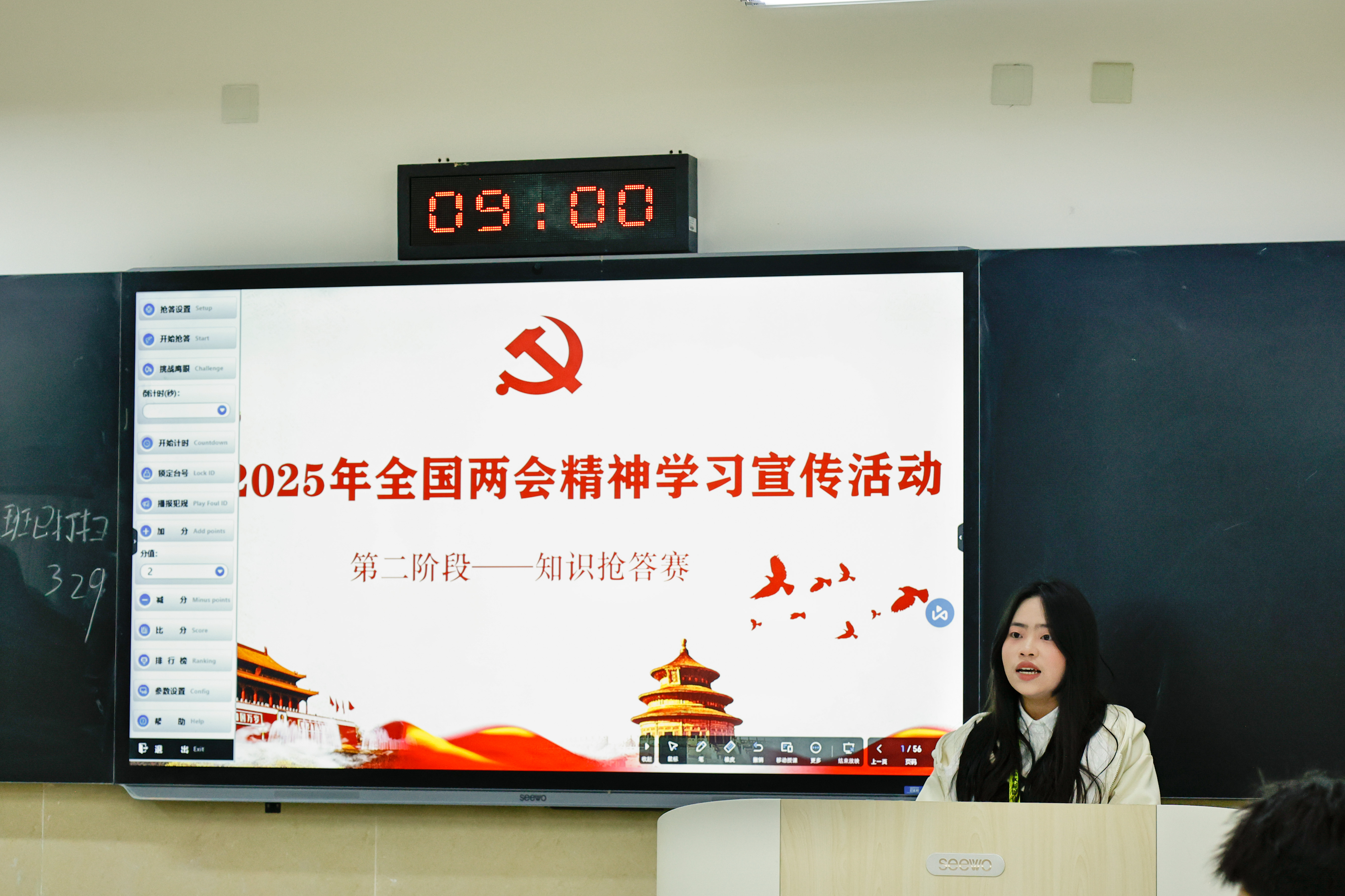 活动依托易班优课平台开设专题学习课群,通过“学、练、赛”一体化设计,组织学校学生开展为期一周的线上知识竞赛,系统学习政府工作报告、代表委员建言及政策解读视频等核心内容,线上测试成绩前10名晋级线下决赛。线下抢答赛设置“政策速递”“热词解码”等三大环节,采用智能抢答器和多媒体互动系统,通过情景模拟、思维导图展示等形式深化学习效果。谈及学习感受,有同学表示:“通过这次学习活动,我对全国两会精神有了更深刻的理解,也意识到我们青年学生肩负的责任。在今后的学习和生活中,我将以两会精神为指引,努力提升自己,为实现中华民族伟大复兴贡献自己的一份力量。”
