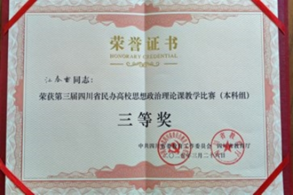 近日,马克思主义学院教师江春雷在第三届四川省民办高校思想政治理论课教学比赛中荣获三等奖。