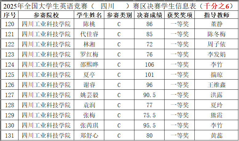5月11日,2025年全国大学生英语竞赛(National English Competition for College Students, 简称NECCS)四川省决赛在四川大学江安校区举行。经过初赛的严格选拔,学校共有12名学生从1992名C类(本科非英语专业组)报名者中脱颖而出,代表学校前往指定赛区参赛,与来自川内56所院校的学生同台竞技。最终,12名参赛学生全部荣获省级一等奖。