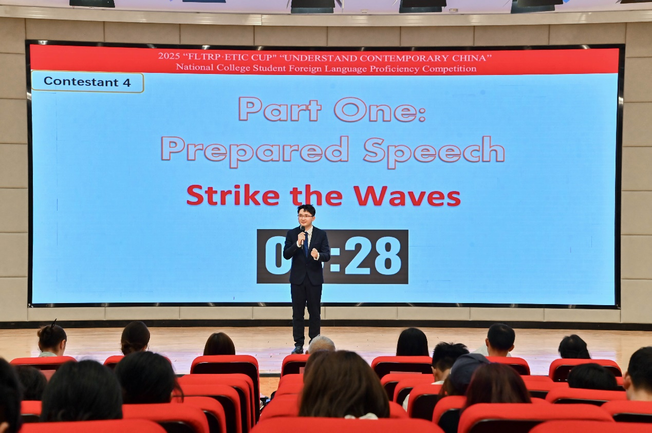 本届大赛以“Strike the Waves(中流击水,浪遏飞舟)”为主题,选手们以饱满的热情和精湛的语言功底,生动诠释了新时代青年勇立潮头、开拓创新的精神风貌。在定题演讲环节,选手们立足全球视野,讲述中国故事;即兴演讲环节展现了敏捷的思维和扎实的语言功底;面对评委的专业提问,选手们更是从容应对,尽显风采。