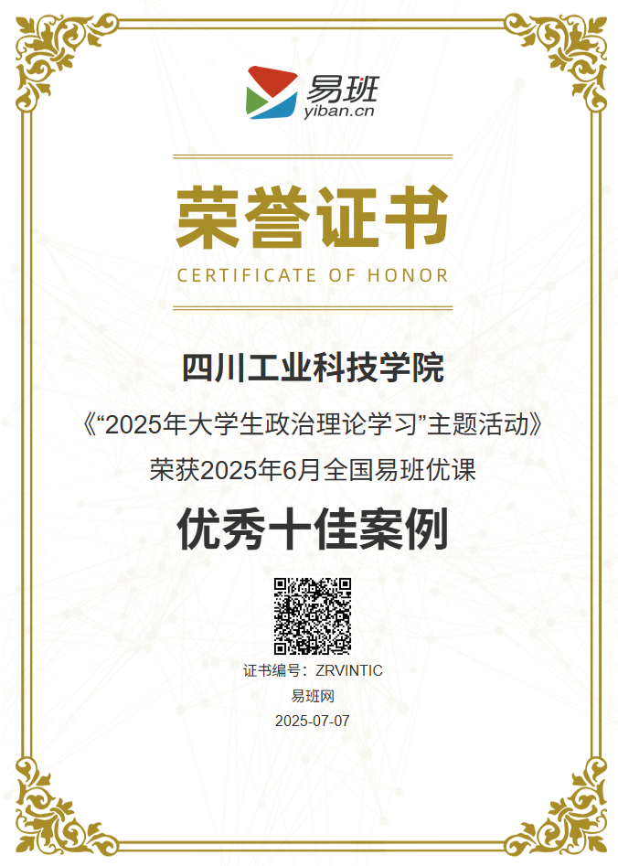 近日,教育部易班网公布了2025年6月全国易班优课“优秀十佳案例”评选结果。学校《“2025年大学生政治理论学习”主题活动》案例荣获全国易班优课优秀十佳案例,易班学生团队主要参与者获“优秀学生骨干”。