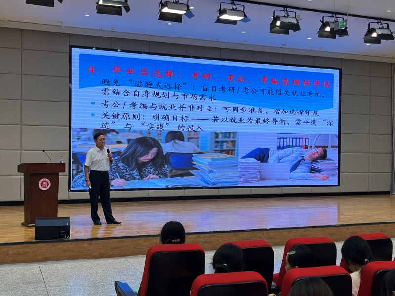李双晶系统阐述了实习就业的重要性,她表示毕业实习是理论联系实际的关键环节,学生要以饱满热情迎接挑战。李双晶重点讲解了实习安全注意事项,从人身安全、财产安全、信息安全、交通安全四个维度深入剖析。她提出安全是实习的首要前提,要求学生在实习期间时刻保持警惕,增强自我保护意识。