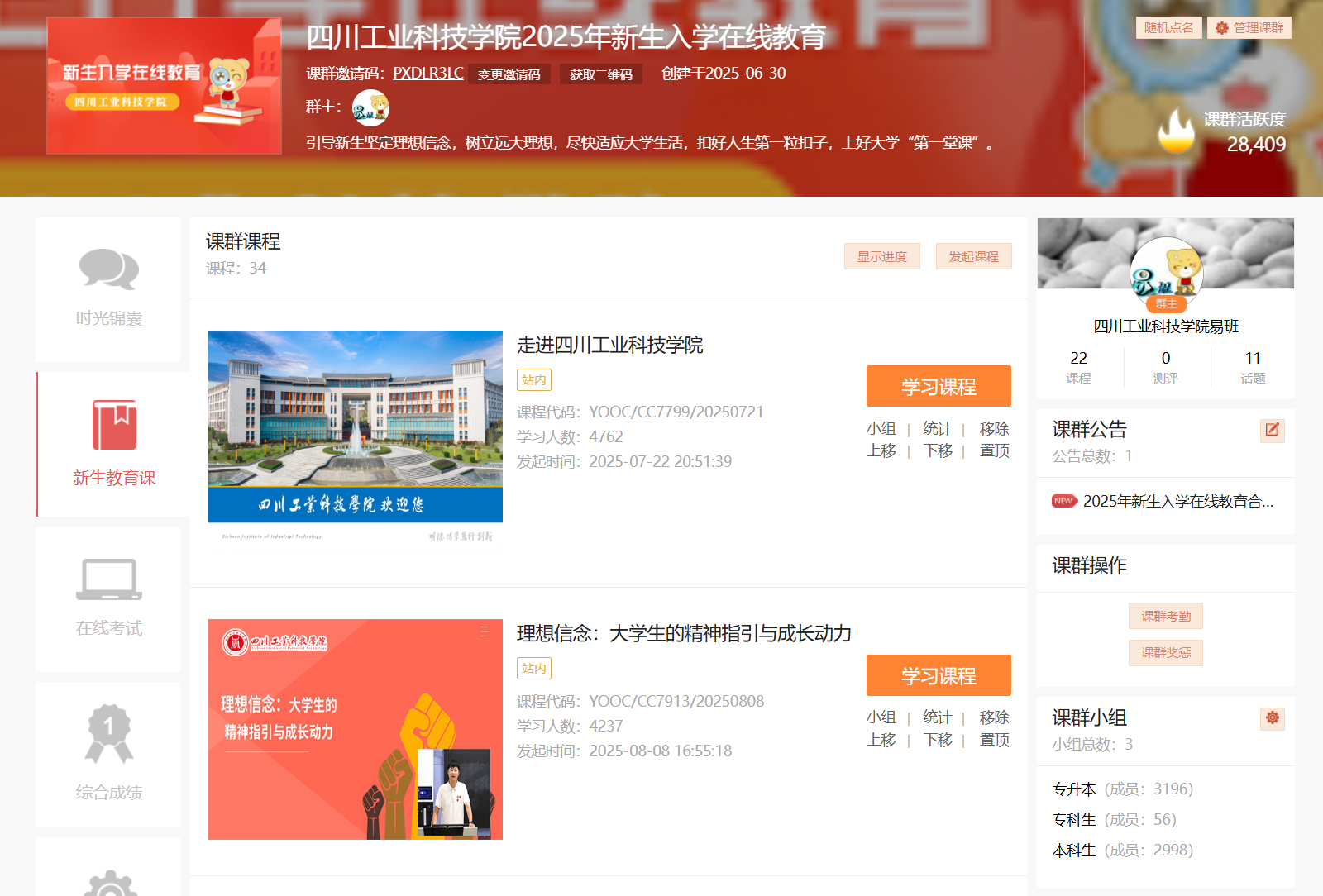 依托易班优课平台,创新开展新生入学在线教育,课程内容涵盖党史学习教育、思想政治教育、安全教育、心理健康教育等10余个模块,34门课程,形成完整的入学教育体系。采用微课程、在线测试、互动讨论等多元形式,增强学习趣味性和实效性,截至目前,已有6000余名新生参与学习,课群活跃度超过30000,这种线上教育模式拓展了教育时空,为新生顺利适应大学生活奠定了坚实基础。