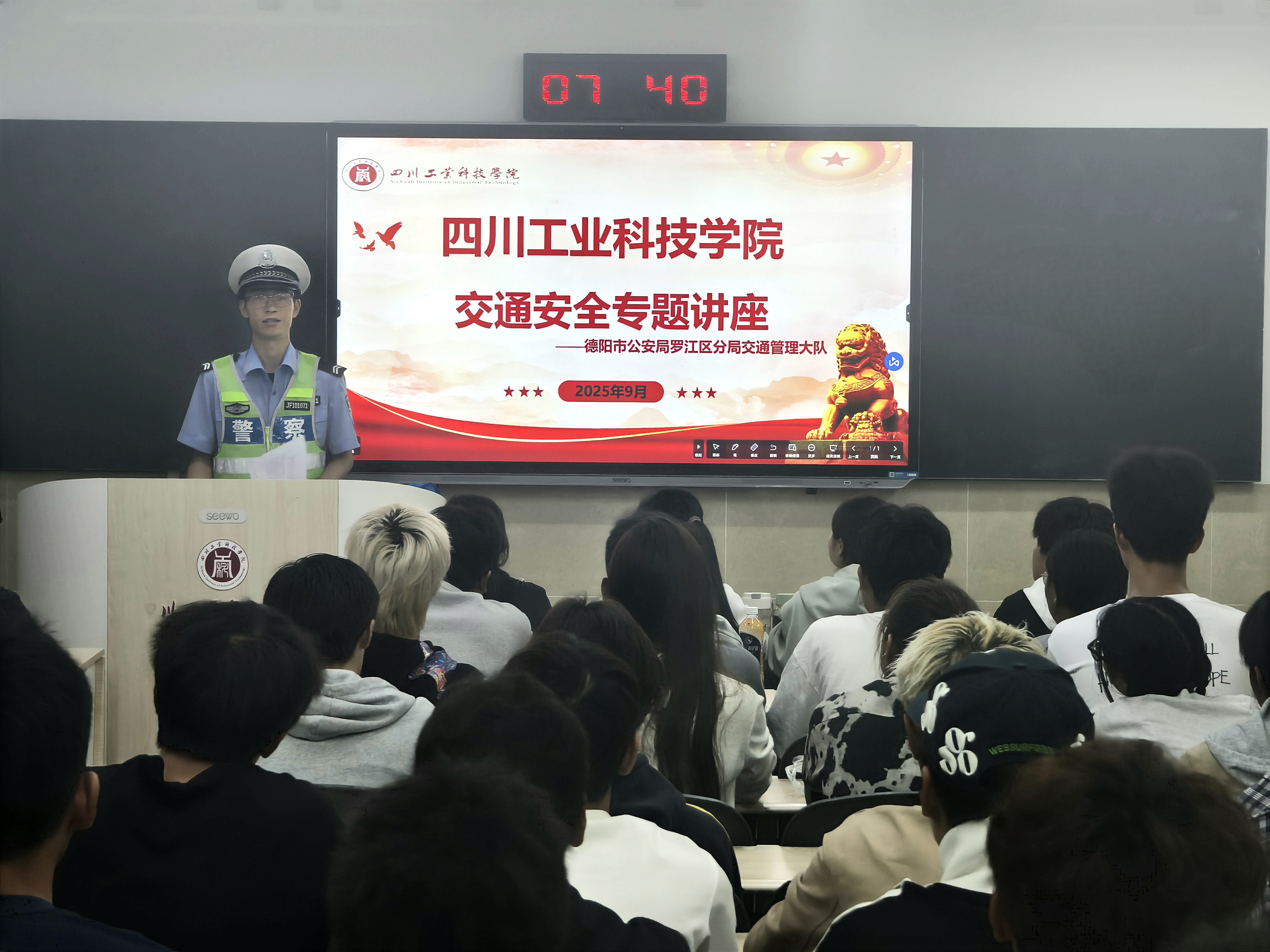 讲座中,汪代雨民警结合高校学生出行特点,以“案例警示+法规解读”的形式展开讲解。他首先通过播放典型交通事故视频、展示辖区内涉学生群体交通违法案例图片,直观呈现了骑行电动车不佩戴安全头盔、横穿马路不观察路况、酒后骑行、违规载人等行为的严重危害,用真实数据和惨痛后果敲响安全警钟,让在场学生深刻认识到交通安全的重要性。