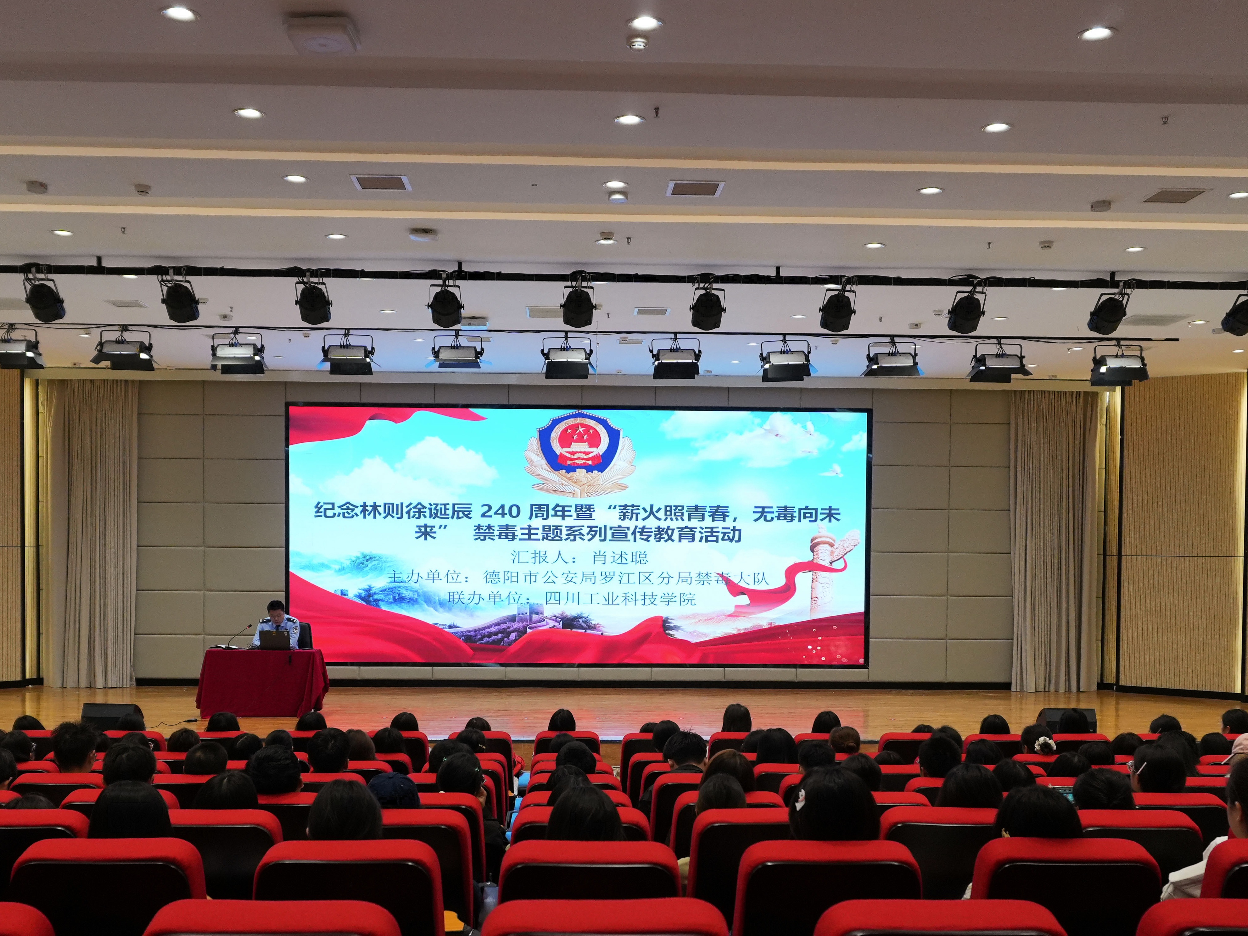为纪念林则徐诞辰240周年,传承禁毒精神,筑牢校园禁毒防线。10月15日上午,学校联合德阳市公安局罗江区分局禁毒大队,在龑江综合楼C区报告厅开展“薪火照青春,无毒向未来”禁毒主题系列宣传教育活动。罗江区公安分局禁毒大队队长肖述聪受邀主讲,学校师生代表参与活动。