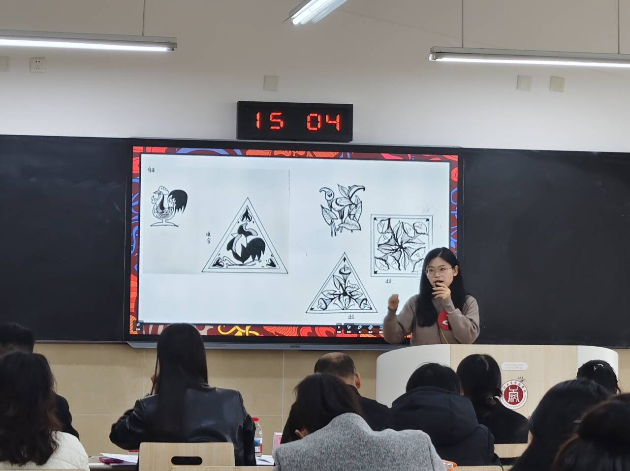 主持人李蕊宣布评分规则,比赛采用多维评价体系,从教学内容、教学方法、语言表达、教态仪表、时间把控五个维度进行综合评分。在课程展示环节,参赛教师各展所长:姚月月老师以《小学发展心理学——“问题及问题解决”》为题,通过情境模拟与案例分析相结合的方式,将抽象理论生动呈现;唐静老师在《剪纸》课程中,将传统艺术与现代教育理念有机融合,引导学生感受非遗文化的独特魅力。