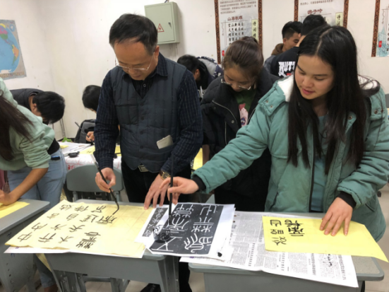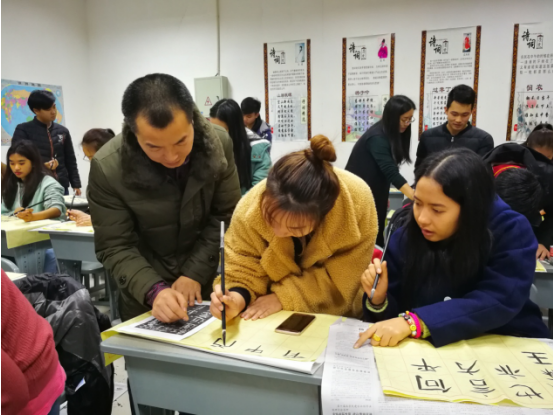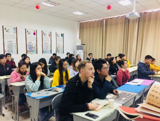 钟伟老师和姜国栋老师先后对中国书法演变历史进行了生动、简明、有趣的讲解,随后展示了名家作品,并深入课堂亲手指导留学生们写书法。