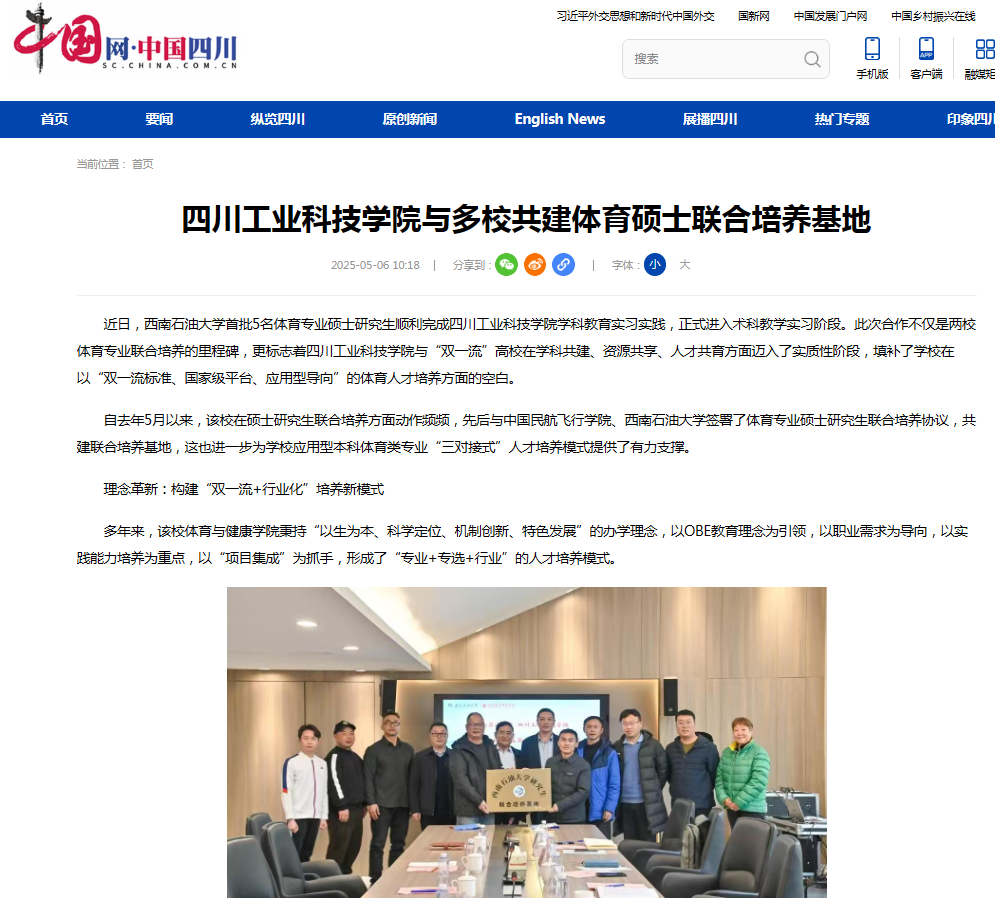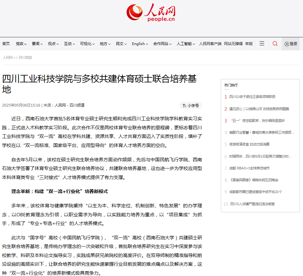 编者按:2025年5月,人民网、中国网、财经头条、德阳日报等国家、省、市级媒体报道学校与多校共建体育硕士联合培养基地,展示了学校与“国字头”“双一流”高校在学科共建、资源共享、人才共育方面的成效。