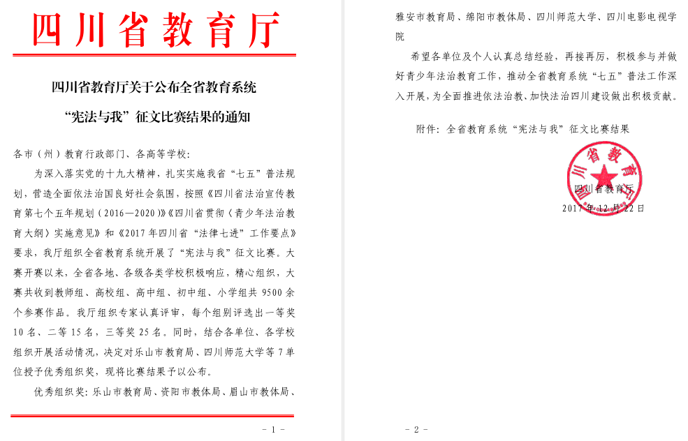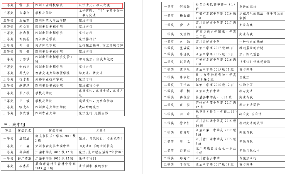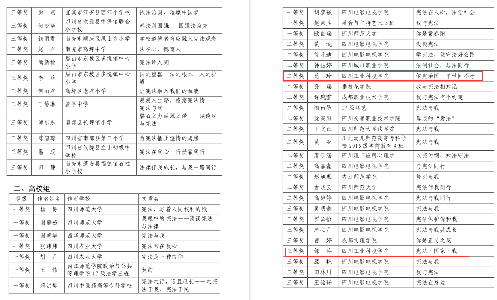 由四川省教育厅举办的四川省教育系统“宪法与我”征文比赛已经圆满落下帷幕,我校工商管理学院范玲同学的作品《依宪治国,平世间不忿》荣获二等奖、工商管理学院邹萍同学的作品《宪法·国家·我》和工商管理学院雷航同学的作品《以法为光,净人之魂》荣获三等奖。