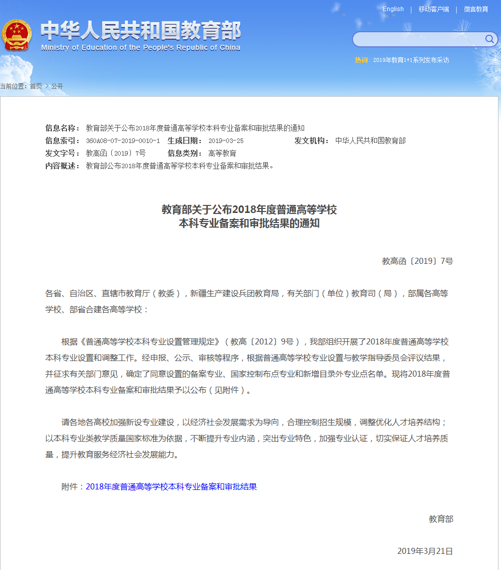教育部关于公布2018年度普通高等学校本科专业备案和审批结果的通知