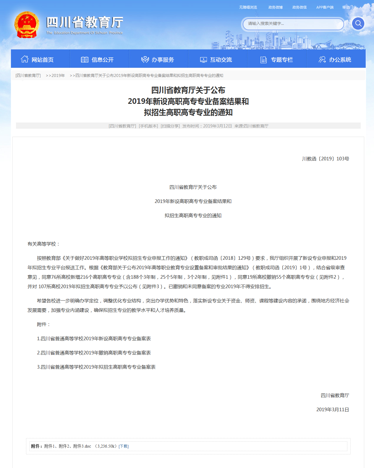 四川省教育厅关于公布2019年新设高职高专专业备案结果和拟招生高职高专专业的通知