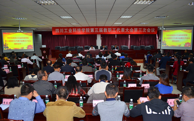 大会在庄严的国歌声中拉开序幕。本次大会的主要议题是审定学校章程的修订稿。学校工会副主席何义兴从《四川工业科技学院章程》起草的背景和意义、起草的主要依据和起草过程、基本结构和内容等几方面对章程进行了仔细、深入的解读。