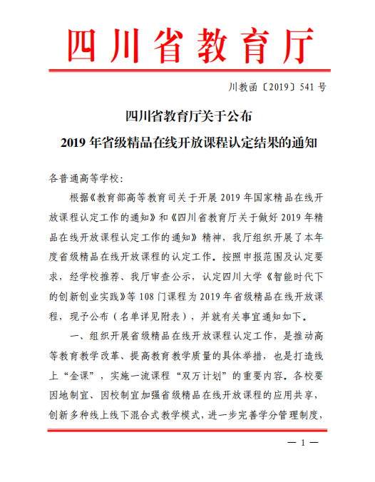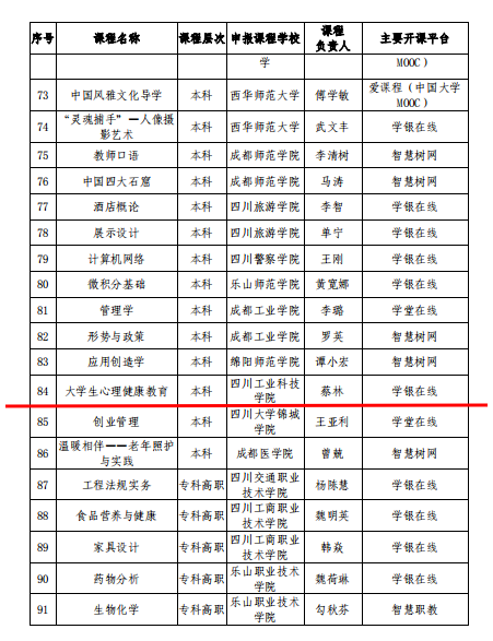 经过学校组织、推荐,省教育厅专家评审,在10月29日四川省教育厅公布的2019年省级精品在线开放课程认定结果通知中,我校蔡林老师负责的大学生心理健康教育入选为2019年省级精品在线开放课程。此次评审入选肯定了我校长期以来积极推动高等教育教学改革、提高教育教学质量、打造具有特色的“金课”、大力加强一流课程建设的工作。