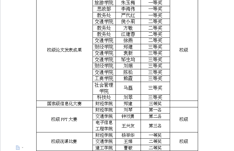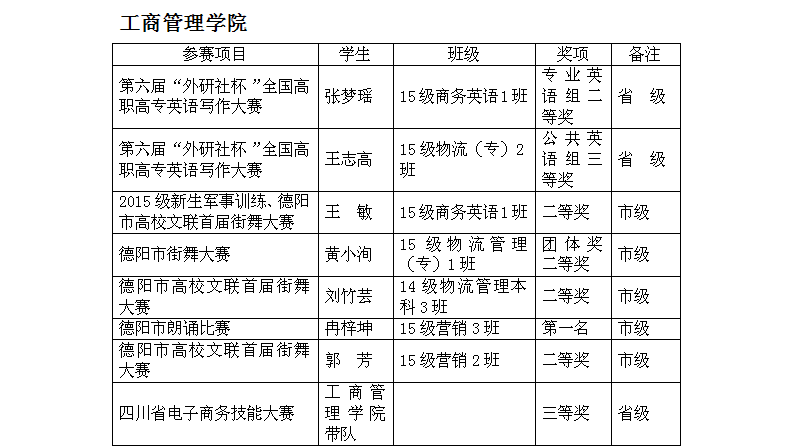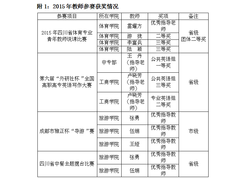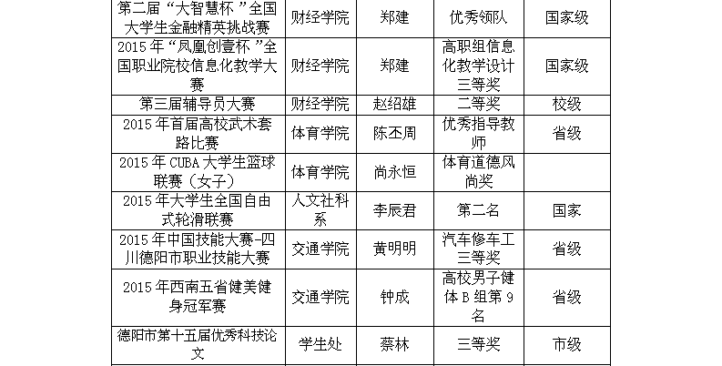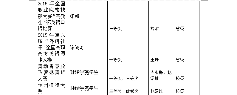 随着教育教学改革的不断深化,学校始终坚持“以生为本,以师为尊”的基本理念, 营造优良教风学风,鼓励师生积极参加各级各类比赛活动,促进师生全面提高。2015年,我校师生在各级各类赛事中,屡获大奖,国家级奖20项,省部级奖15项,市级奖10项。其中王丹老师在第六届“外研社杯”全国高职高专英语写作大赛中指导学生获得公共英语组一等奖;财经学院肖强、刘福宇同学在第二届“大智慧杯”全国大学生金融精英挑战赛中获得金融操盘手一等奖,体育学院何泽军同学在“2015年首届高校武术套路比赛”中荣获男子刀术第一名。