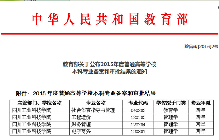 日前,教育部发布了《教育部关于公布2015年度普通高等学校本科专业备案和审批结果的通知 》(教高[2016]2号)文件。经教育部学科发展与专业设置专家委员会评议,我校申请的社会体育指导与管理、工程造价、财务管理、电子商务4个本科专业通过教育部备案和审批,学位授予门类分别为教育学和管理学,可从2016年9月开始正式招生。至此,学校已有本科专业12个,涵盖了工学、管理学、经济学、教育学四大学科门类。