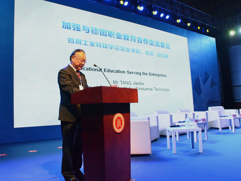 会上,菲舍尔作“欧盟企业在中国西部之机遇”的演讲,库卡工业机器人中国区域研发部负责人弗洛里安·马德作“德国工业4.0如何推动西部经济和德阳建设国家重大装备产业创新发展基地”的演讲,德国工商大会职业教育总监白丽塔作“工业4.0对职业教育的影响”的演讲,中国职业教育学会副会长陈晓明作“协同优化:中国制造2025下职业教育支撑对策”的演讲。唐健禾教授以《加强与德国职业教育合作的构想》为题发表讲话。他向大会来宾,特别是远道而来的德国嘉宾致以诚挚的欢迎!随后介绍了学校近年来在积极探索培养高端技术技能人才新路径方面的努力和成果。唐健禾表示,与德国相关高校和企业开展交流活动,建立合作伙伴关系,学习德国先进的教育理念、经验和方法是促进我校职业教育深入改革和持续发展的关键。
