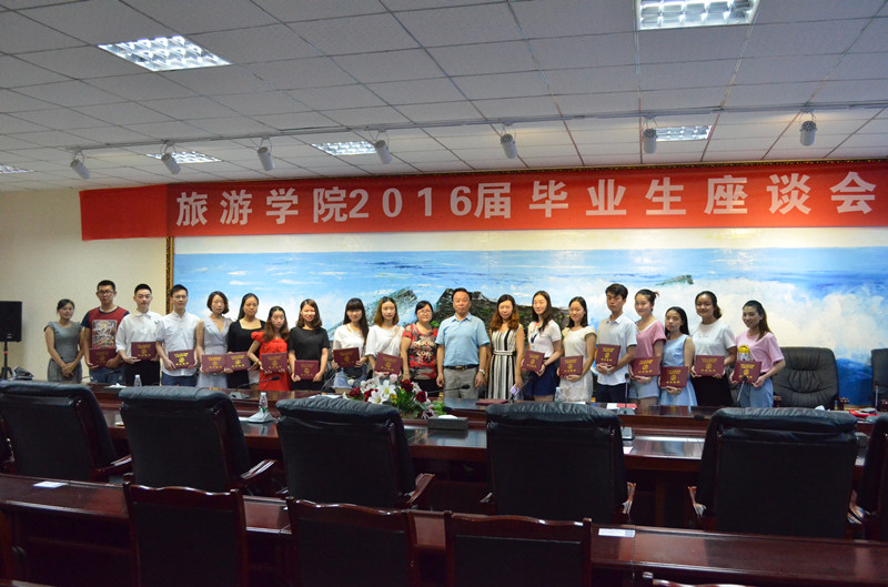 何义兴出席旅游学院毕业生座谈会。何义兴在座谈会上为旅游学院毕业生代表颁发毕业证书,并于毕业生代表合影留念。