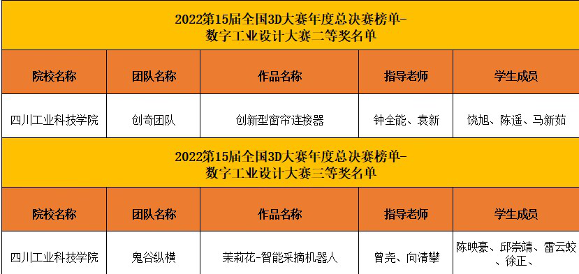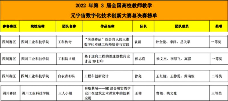 在学生获奖方面,智能制造与车辆工程学院学子荣获2022年第七届四川省大学生机器人大赛一等奖,荣获第15届全国3D大赛年度总决赛全国二等奖一项、三等奖一项。在教师获奖方面,智能制造与车辆工程学院教师斩获2022年第三届全国高校教师教学元宇宙数字化技术创新大赛总决赛获国家一等奖两项、国家二等奖一项,建筑工程学院教师获得国家三等奖一项。