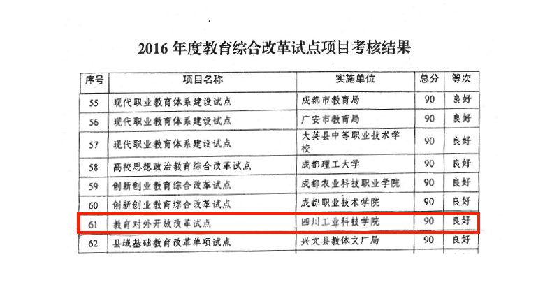 近日,四川省教育体制改革领导小组办公室下发了《关于 2016 年度教育综合改革试点项目考核结果的通报》(川教改办2016[6]号),公布了全省第一、二批教育综合改革试点项目考核结果,通报了各试点项目信息报送情况。我校承担的“教育对外开放改革试点”项目以90分的总分被评为良好。项目成果《契合“一带一路”战略 免费培养老挝留学生》入编《四川省教育综合改革试点项目(第一、二批)阶段成果集》。