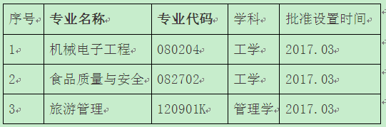 从《教育部关于公布2016年度普通高等学校本科专业备案和审批结果的通知》(教高[2017]2号)获悉,学校新增设机械电子工程、食品质量与安全、旅游管理3个本科专业获得批准备案,将于2017年开始招生。