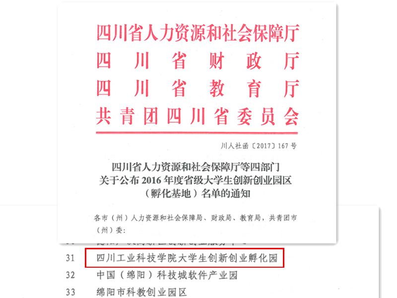 日前,根据《四川省人力资源和社会保障厅等四部门关于公布2016年度省级大学生创新创业园区(孵化基地)名单的通知》(川人社函〔2017〕167号),经四川省人社厅、省财政厅、省教育厅、共青团省委四部门审核,我校大学生创新创业孵化园被认定为省级大学生创新创业园区。