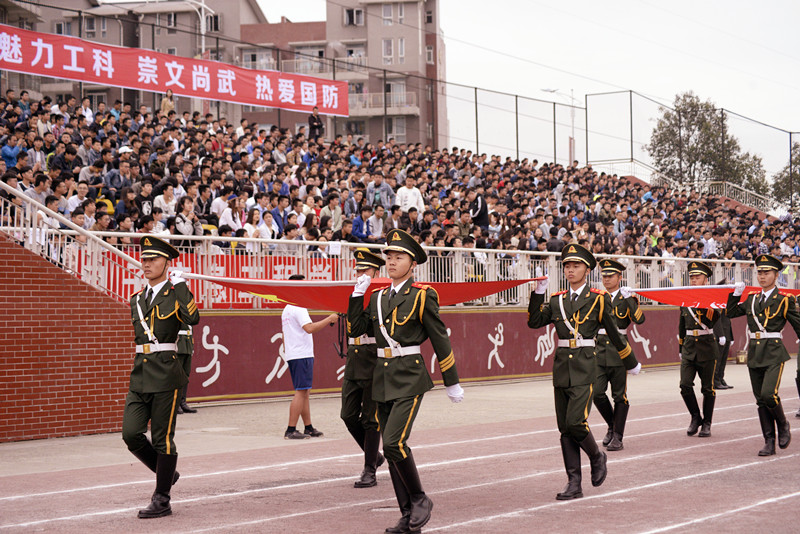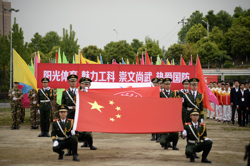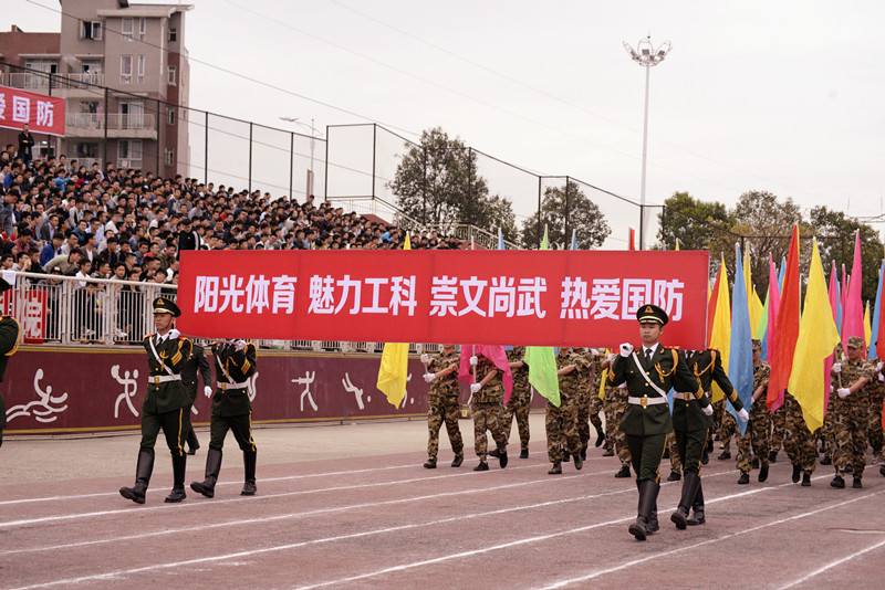 庄严的升旗仪式后,唐健禾致开幕辞。他代表学校党政向运动会的举行表示热烈的祝贺,向参加本届运动会的全体运动员、教练员、裁判员,参加展示的全体军训教官和特训队员表示诚挚的慰问。他指出,学校在不断的壮大和发展中,始终把提高学生综合素质作为立德树人的重要内容。近年来,学校全面贯彻党的教育方针,坚持教育创新理念,运用科学的管理方法,不断提高教育教学水平,业已形成良好的校风、学风、教风,赢得社会广泛认同的良好声誉。全校师生员工锐意进取,以“担当社会责任的教育,培养担当社会责任的人才”为办学理念,不断加强学校跨越式发展步伐。在狠抓教学质量提高的同时,积极开展形式多样的国防教育活动,承担部分高校新生军训任务,承办教育部组织的“军事课教学展示活动”,学校被确定为全国首批“国防教育特色学校”,学校独有的“国防教育”办学特色得到了教育部和四川省军区、教育厅的高度肯定。此次运动会以 “阳光体育,魅力工科,崇文尚武,热爱国防”为主题,旨在倡导广大同学积极参与体育活动,努力强身健体,同时强化国防意识,激发爱国热情。