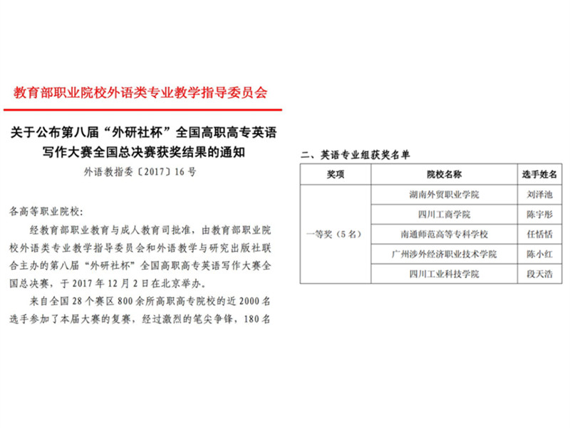 本次大赛分公共英语组和英语专业组进行。来自全国28个赛区800余所院校的近2000名选手参加了本届大赛的省级决赛。经过激烈的笔尖争锋,28个省级赛区推选了180名选手晋级全国总决赛,我校2015级商务英语专业的学生段天浩同学即是这180名选手之一。他以校区初赛第一名的成绩代表我校参加四川省决赛,以第二名的成绩获四川省省级决赛特等奖后,被四川省大赛组委会推举、代表四川参加全国总决赛。在总决赛中他不负众望,进入全国前5强,并荣获全国总决赛英语专业组一等奖。其指导老师朱玉梅获优秀指导教师奖。