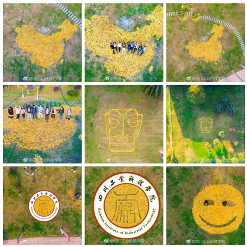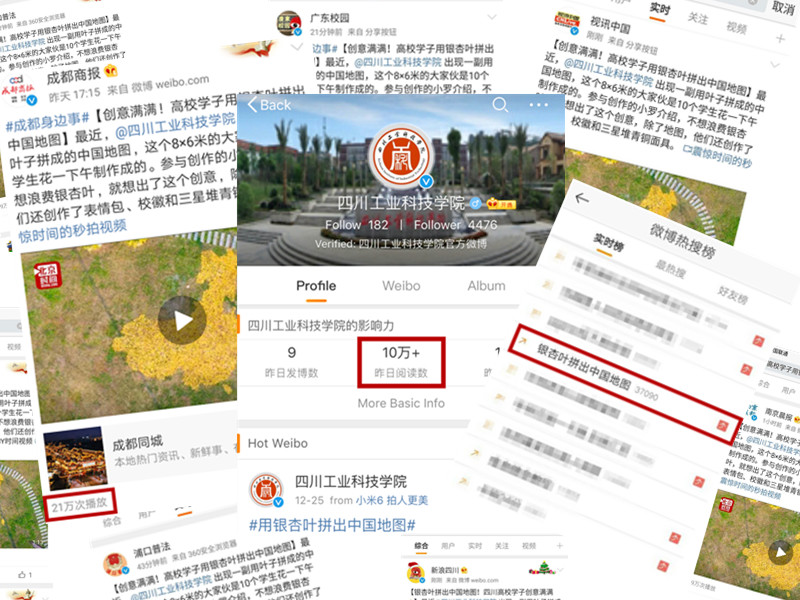12月25日,学校官微发布题为《太有才了|工科学子用银杏叶拼出了巨幅中国》的推文。文中,大学生传媒中心同学们用学校的银杏落叶拼出中国地图、三星堆青铜面具、校徽等巨幅图画,表达对学校、对德阳、对祖国的热爱。满满的创意微信被省教育厅官微采用推送,阅读量达4000次,并引得头条校园、新浪四川、网易、视讯中国北京时间、四川在线、德阳电视台等众多媒体及网络大V争相报道转载,短短1小时,新浪四川、扬州交通广播微博视频点击超过9万次,成都商报微博视频点击率超过21万次,微博热搜27400多次,我校官方微博当日阅读量已达10万+。