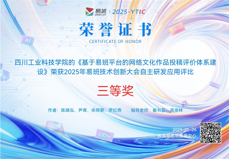 5月26日,教育部易班发展中心主办的2025年全国高校易班技术创新大会在珠海圆满落幕。由崔书磊、高渝林老师指导,陈婧泓、尹青、佘荷黎、罗红燕四位同学完成的《基于易班平台的网络文化作品投稿评价体系建设》项目荣获自主研发应用全国三等奖。