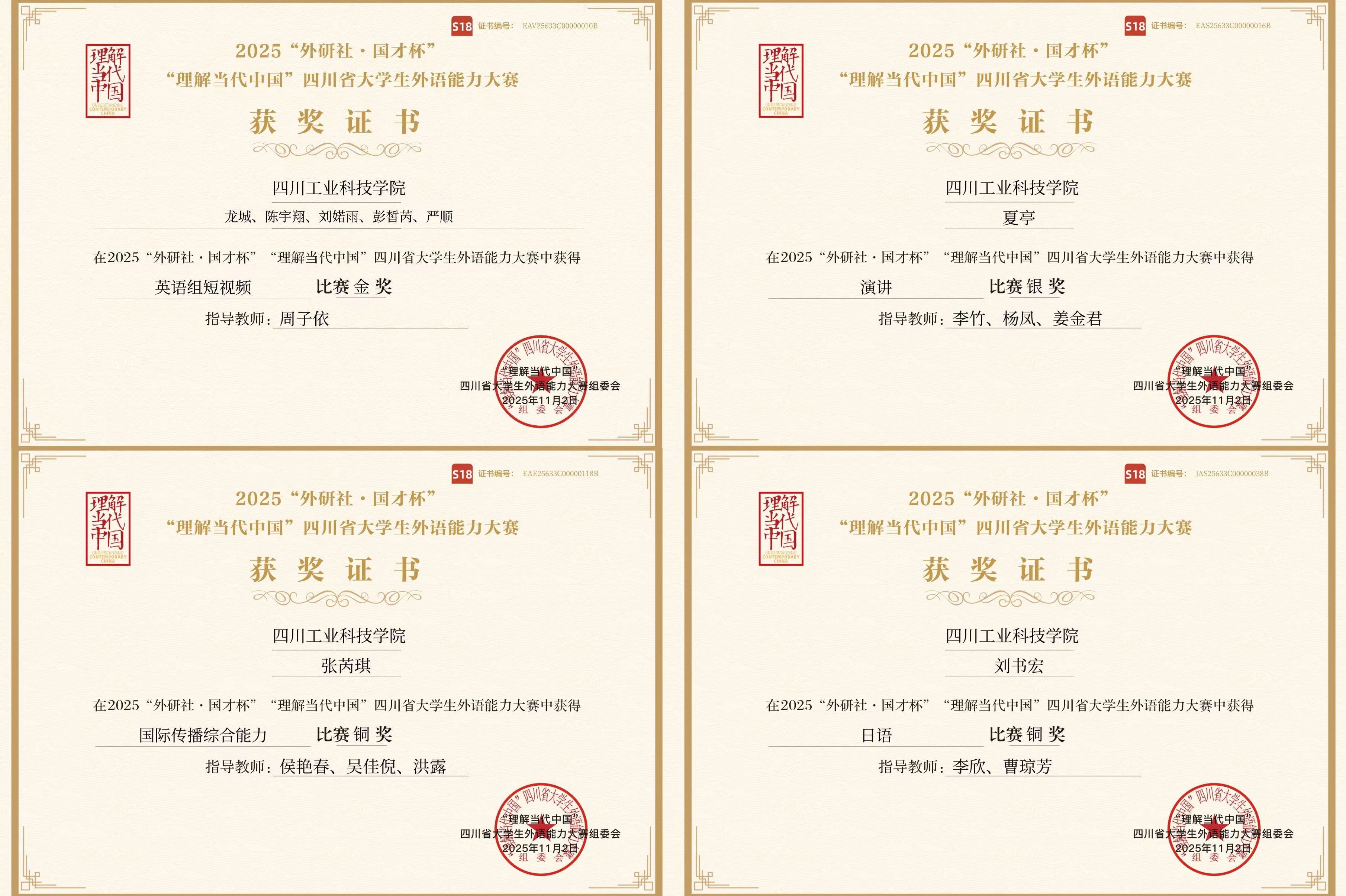近日,“2025‘外研社·国才杯’‘理解当代中国’四川省大学生外语能力大赛”在成都理工大学圆满落幕。学校学子在英语短视频、英语演讲、国际传播综合能力、英语笔译和日语五个赛项中表现优异,共斩获金奖一项、银奖一项、铜奖两项,并有两位选手顺利晋级全国决赛,创下学校在该项赛事中的历史最佳成绩。