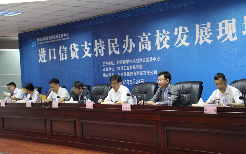 5月24日,由教育部学校规划建设发展中心主办,四川工业科技学院承办,北京展佳教育科技有限公司协办的进口信贷支持民办高校发展现场会在我校图书馆D—08会议室举行。教育部学校规划建设发展中心主任陈锋、教育部学校规划建设发展中心校企联盟常务副秘书长郭军、中国进出口银行转贷部外事处副处长李公正、四川省教育厅机关党委书记李志刚、罗江区政府区长李栋、罗江区政府副区长周红英、四川工业科技学院党委书记魏崛、北京展佳教育科技有限公司董事长迟海,以及来自全国60余所民办高校进口信贷项目负责人出席了本次现场会。