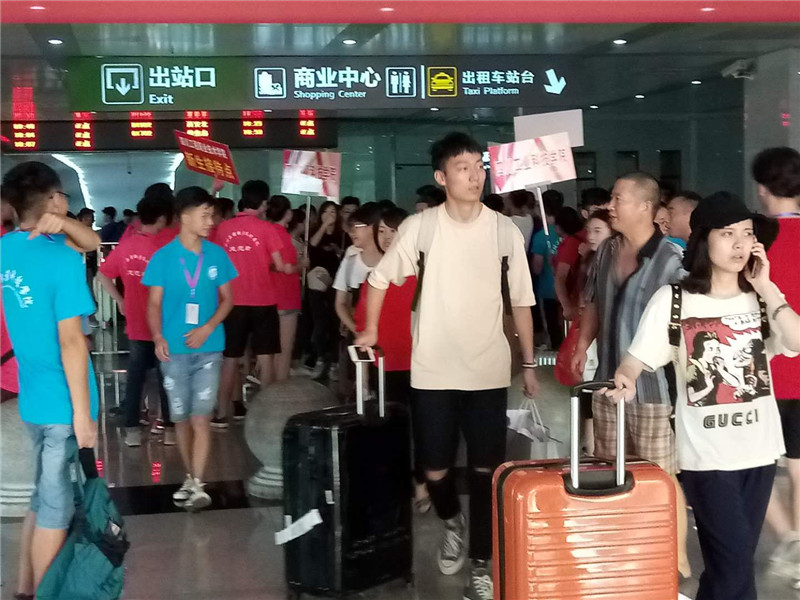 今年学校的志愿者人数达到了400余人,分布在车站、学校周边、报到处、学生公寓,帮助新生及家长报到注册、搬运行李、答疑释惑、提供志愿服务。学校在家长休息区设置了行李寄存处,有专门的志愿者为新生和家长们存放保管行李;休息区和报到处放置了饮水机和纸杯以供新生和家长饮用;学校周边及校园内各个路口还设置了服务引导牌,为新生和家长带来了便利。