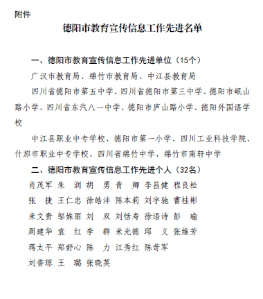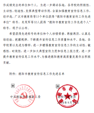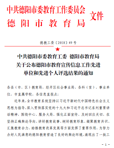 近日,接中共德阳市委教育工委、德阳市教育局联合下发的《关于公布德阳市教育宣传信息工作先进单位和先进个人评选结果的通知》(德教工委〔2018〕49 号),我校教务处教师郑舒心荣获德阳市教育宣传信息工作先进个人,学校荣获先进单位,这是我校连续七年荣获德阳市教育宣传信息工作先进单位。