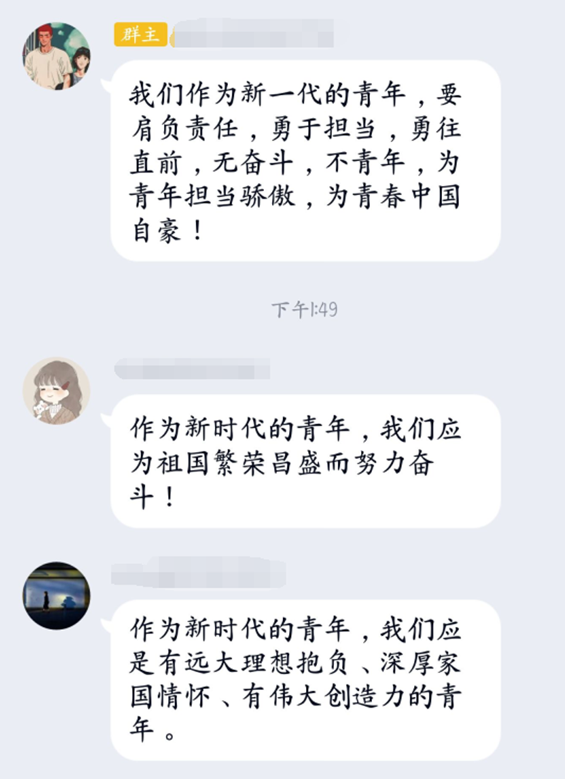 习近平总书记的深情寄语、殷切嘱托,极大鼓舞了广大青年积极拥抱新时代、奋进新时代。总书记的深情寄语、殷切嘱托,极大鼓舞了广大青年积极拥抱新时代、奋进新时代。“青春是用来奋斗的,奋斗本身就是一种幸福。作为新青年的我们,应该树立远大理想,学习新时代爱国思想,努力提升自身文化知识水平和道德素养,弘扬五四精神,担起时代责任。”同学们纷纷表示,要牢记习近平总书记寄语,继承和发扬五四精神,在实现中华民族伟大复兴中国梦的新长征路上奋勇搏击。