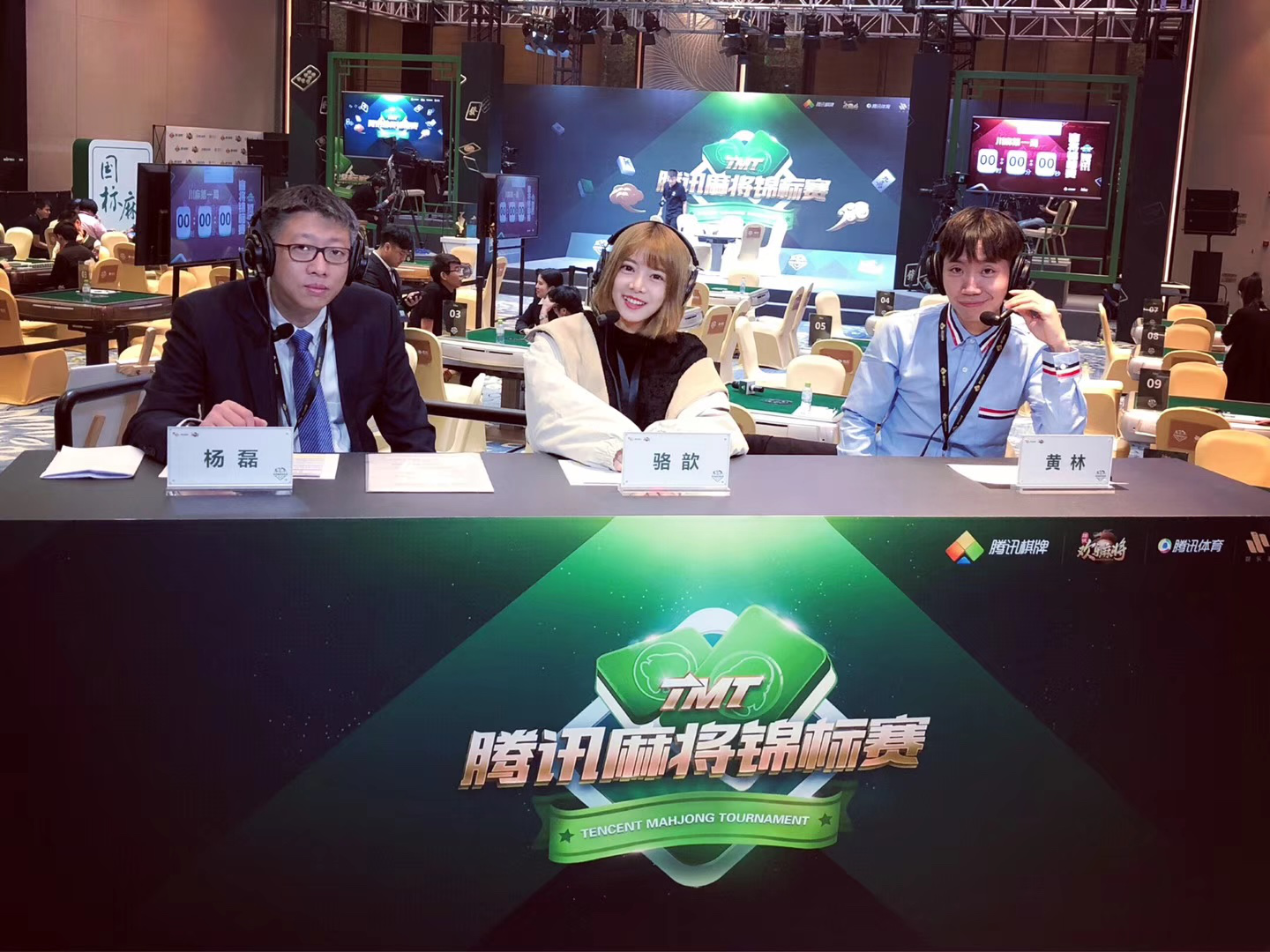 图为黄林老师搭档LOL著名解说骆歆和全国竞技麻将冠军杨磊解说比赛