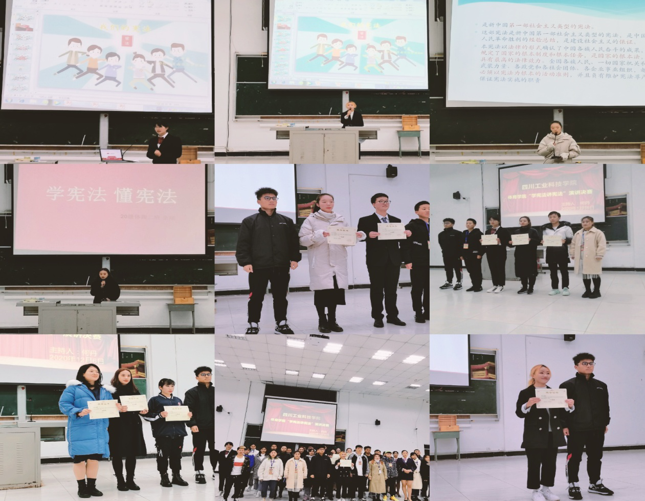 体育学院为尊崇宪法、学习宪法、遵守宪法、维护宪法、运用宪法。四川工业科技学院积极响应国家号召,于2020年12月3日晚上7点在教学楼311和313教室开展“宪法知识竞赛”预赛。进入决赛的同学于12月6日参加第二轮宪法演讲比赛。同学们积极参与此次活动。本次活动由团总支和焦点励志社承办和开展。