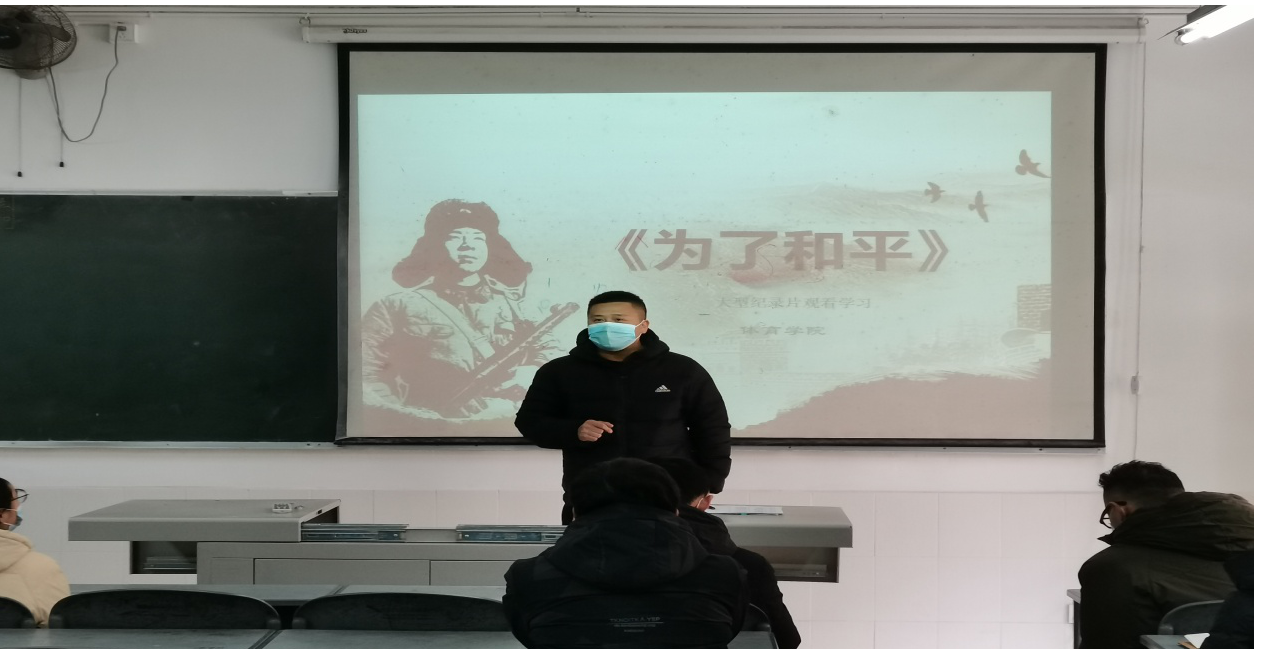 在抗美援朝70周年之际,为了激励广大教师弘扬爱国主义精神,承担保卫和平的历史使命,12月17日中午,四川工业科技学院体育学院全体职教于112教室组织观看纪录片《为了和平》。参加本次观影活动的是四川工业科技学院全体教职工,活动由陈乐民、张双全两位老师主持。